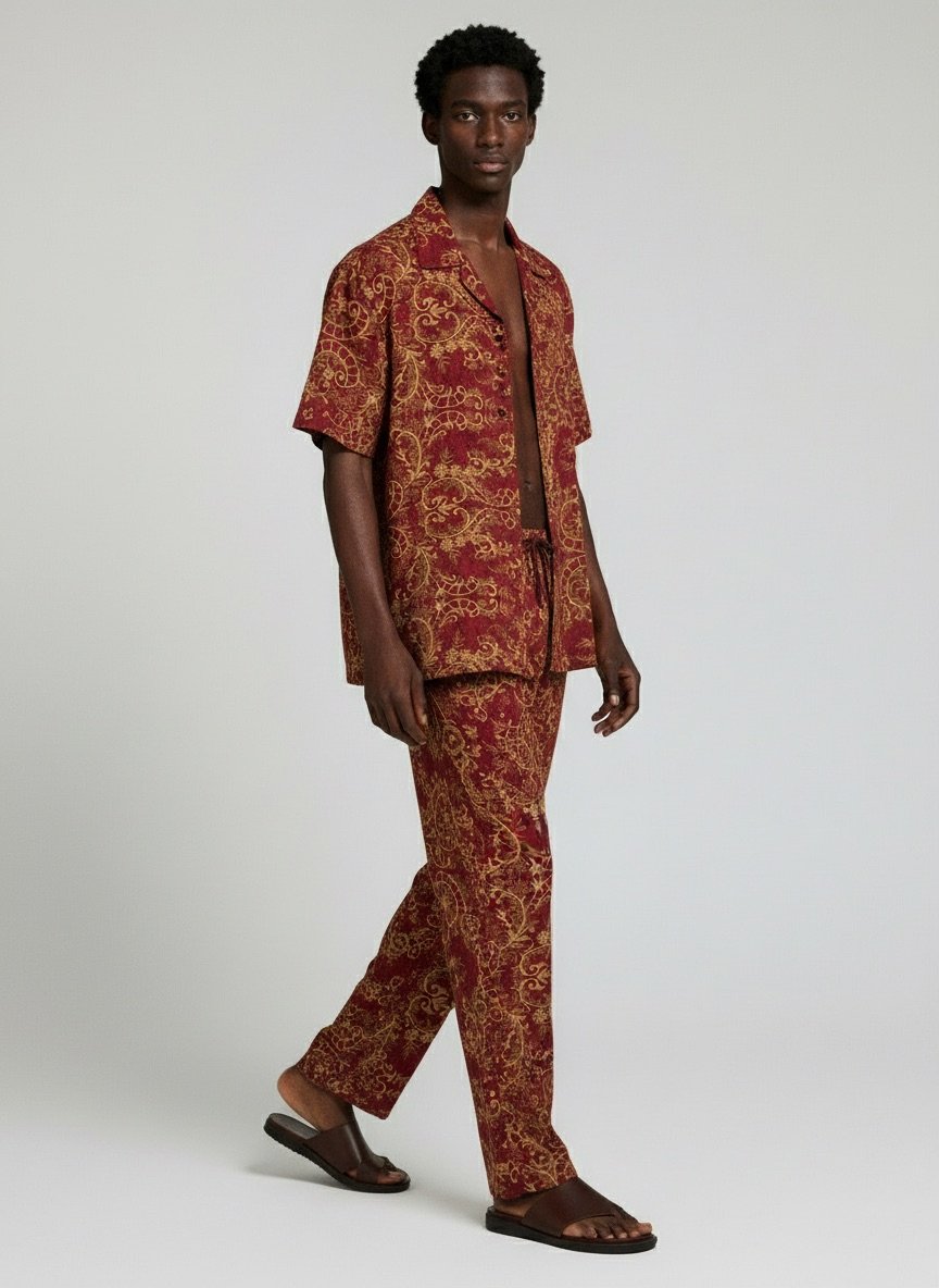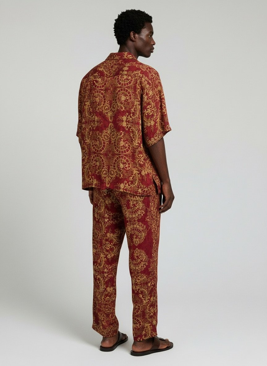 Lüks ipek saten kullanılarak üretilen bu iki parçalı erkek takımı, bordo ve altın tonlarının zengin bir birleşimini sunar. Rahat kesimli gömlek ve geniş paçalı pantolon, zahmetsiz ama sofistike bir siluet yaratır; sade lüksü takdir edenler için tasarlanmıştır.